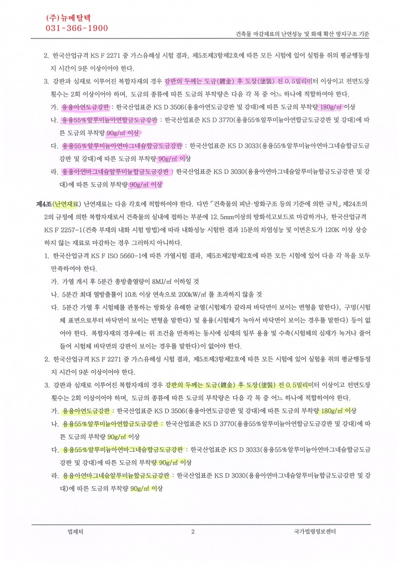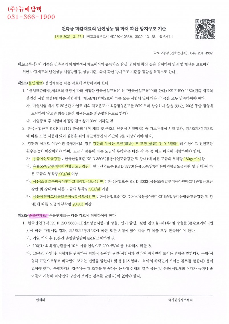 건축물 마감재료의 난연성능 및 화재 확산 방지구조 기준국토교통부고시제2020-1053호 불연준불연 양면0.5t 시행20210327 뉴메탈텍.pdf (174.4K) 539회 다운로드 DATE : 2021-01-22 16:19:27