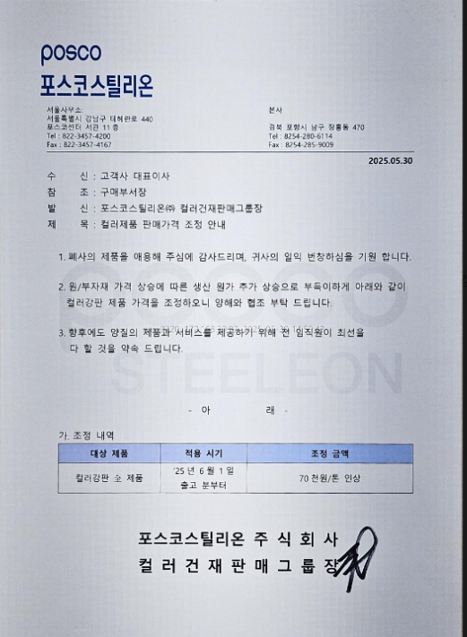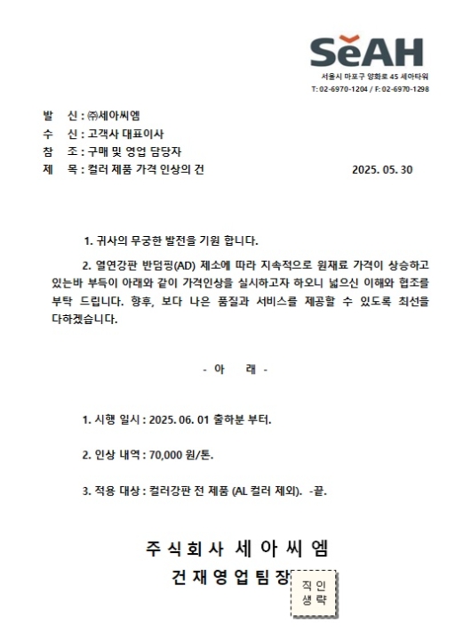 2025년 6월2일 출고분부터 바로 톤당 5만원~7만원인상됩니다.